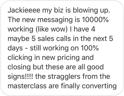 Jackie’s program has given me laser clarity on who I serve. My messaging and marketing feel much clearer. And I have tools that I have learned that move the needle in my business.”